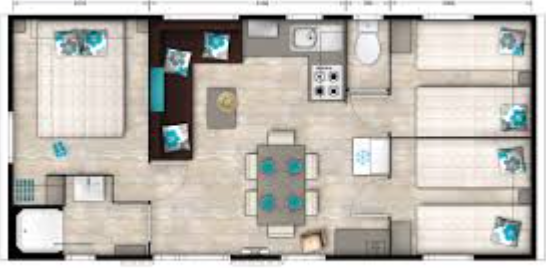 Wir bieten vier Gareth-Mobilheime mit 33 m2 (3 Schlafzimmer), die Platz für 6 Personen bieten. Diese Mobilheime verfügen über eine überdachte Terrasse von 13,50 m 2.