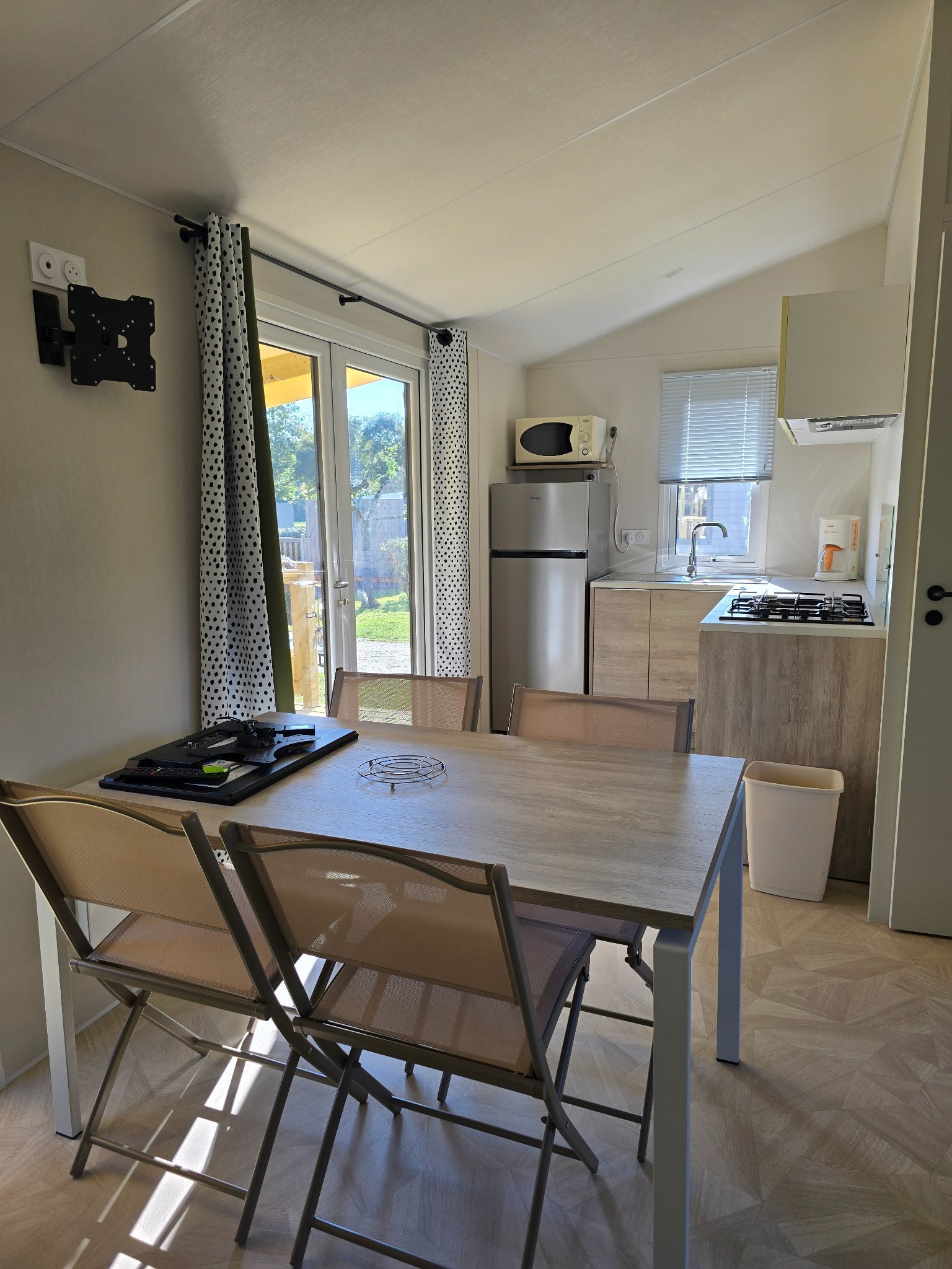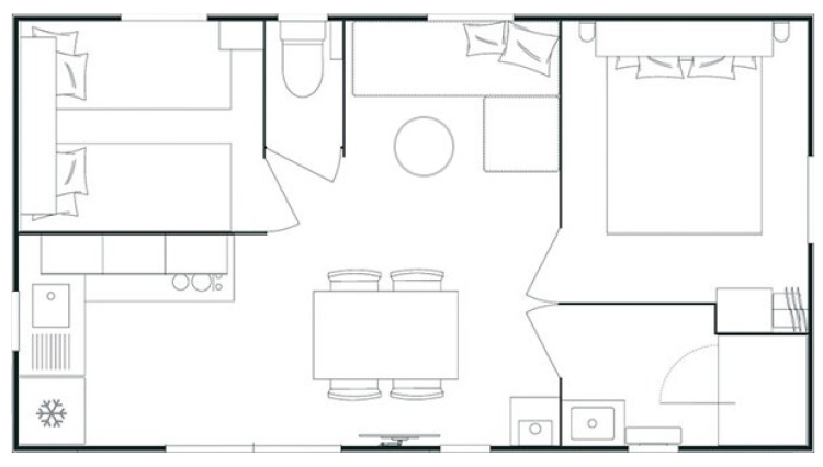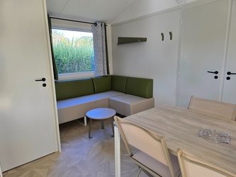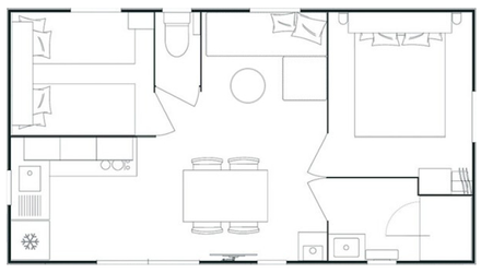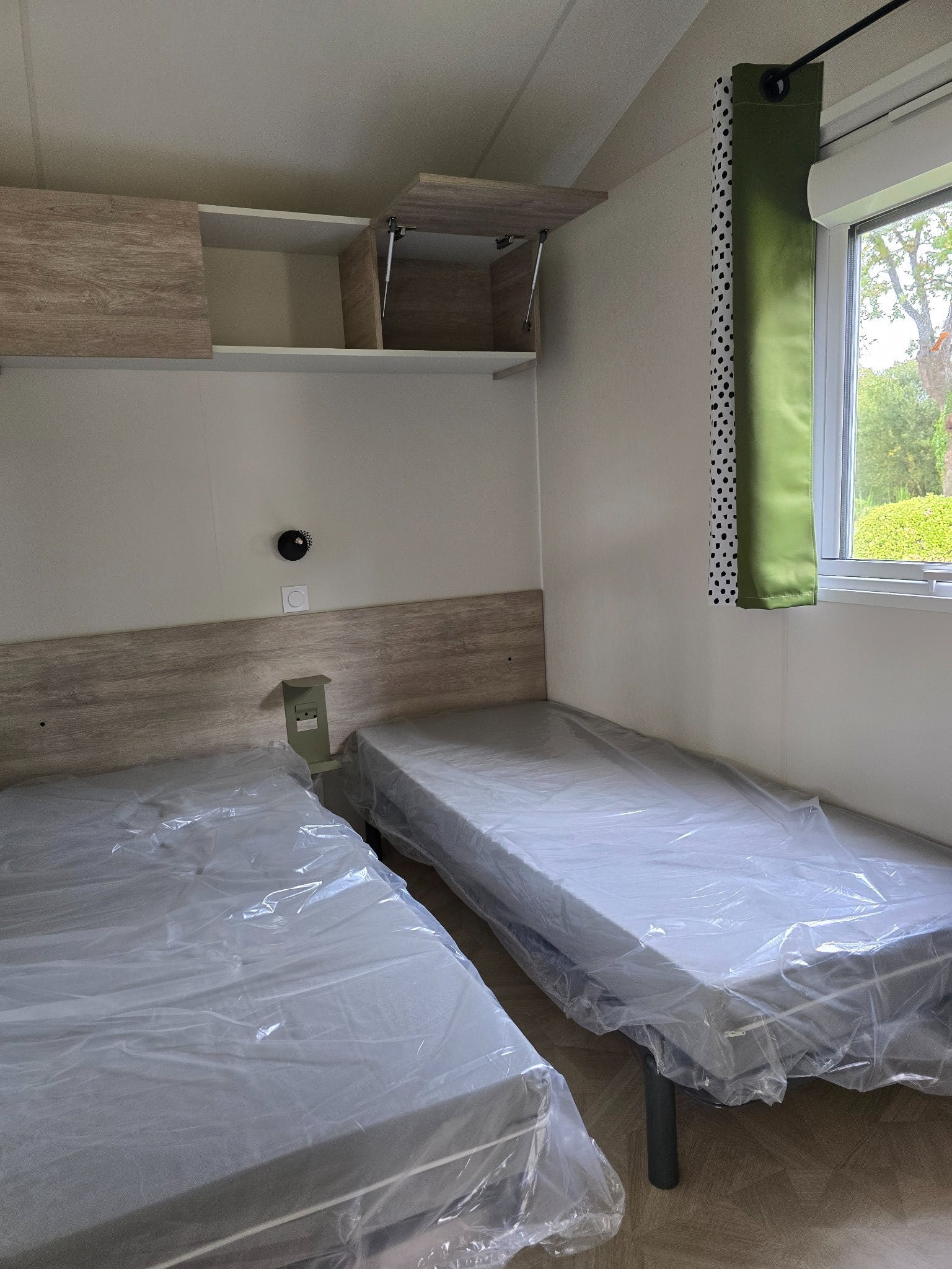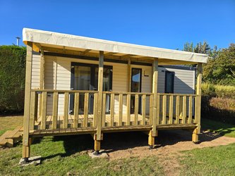 Nous proposons un mobil-home Chevalier Gauvain de 27 m² (2 chambres) pouvant accueillir 4 personnes. Ce mobil-home dispose d’une terrasse couverte de 11.50 m².